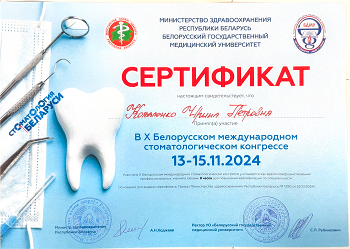 • 2012–2015 гг. — обучение в очной аспирантуре на кафедре терапевтической стоматологии ГУО «Белорусская медицинская академия последипломного образования»